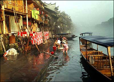 小城的閑適不因你的到來而驚擾,不因你的離去而暗淡,跨進(jìn)店門時(shí)的那淺淺的微笑,足以讓你溫馨半晌。走累了,撿一塊江邊的石階坐一會(huì)兒,掬一捧清水涼爽一下心情,看一看河面跳巖上過往穿梭的游人和頭戴尖梭身著粗布肩擔(dān)竹筐的當(dāng)?shù)孛缑?講著故事的船家撐著竹竿駕著小舟順流而下,兩岸古樸而又錯(cuò)落有致的吊腳樓群;聽一聽,近處水車攪動(dòng)河溪清亮亮的流水聲和遠(yuǎn)處伴著牛皮大鼓飄來的苗家妹子的甜甜山歌。不知不覺夜色闌姍,通河掛滿紅紅的燈籠,滿江飄蕩著歌聲,你混然不覺自己已在夢中游,成畫中仙,時(shí)間在這里永遠(yuǎn)的凝固。每個(gè)走進(jìn)鳳凰的游人都情不自禁地放慢腳步,推遲行程,來細(xì)細(xì)品味這難得的湘西美景。