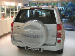 在維特拉的備輪上依然是放在后門上,單從外面輪廓來看,頗有點像本田的樣子。行李廂的門是側開的,為卸裝行李提供了較大的方便,鈴木商標非常顯眼地在備胎上顯示出來。