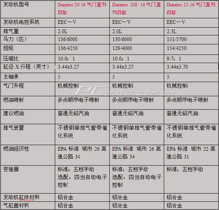 Duratec 20E發(fā)動機(jī)是Focus S、SE和SES系列在加利福尼亞、馬薩諸塞州、紐約、佛蒙特州和緬因州的標(biāo)準(zhǔn)配置,在亞利桑那州、內(nèi)華達(dá)州、美國新罕布什爾州、新澤西州、俄勒岡州、賓夕法尼亞州和羅得島州則作為可選配置。