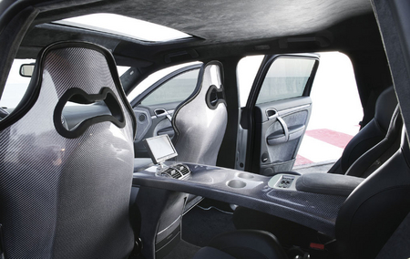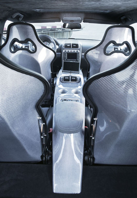 車內延續了奢侈的運動氣息,四個獨立的Croba或Recaro運動式座椅,風格前衛的中控板從變速箱一直延伸到后座。面板上裝備有實用的杯座和豐富的汽車資訊娛樂系統,其中包括德國Blaupunkt顯示屏、DVD播放器和PS游戲機等。內飾也采用了大量的頂級素材:黑色間深灰色的皮革,搭配大量銀色碳纖維材料將從方向盤到門把等各個部分都妝扮起來,更有許多手工制作的細節部分點綴其“運動”色彩。