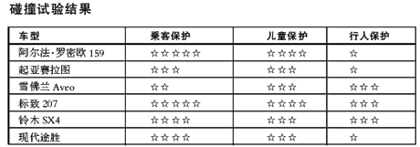 2月24日,歐洲新車評估機構Euro NCAP公布了6種車型的碰撞試驗結果。參加試驗的6種車型包括阿爾法·羅密歐159、起亞賽拉圖、雪佛蘭Aveo、標致207、鈴木SX4及現代途勝。