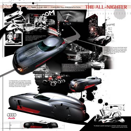 “奧迪Nero”(大眾奧迪加利福尼亞設計中心,Volkswagen/Audi Design Center California)。靈感來自20世紀30年代由汽車聯盟股份有限公司(Auto Union GmbH)生產的賽車。車身顏色為碳黑色,帶有洛杉磯色彩。發動機罩采用半透明設計,可以看見發動機。