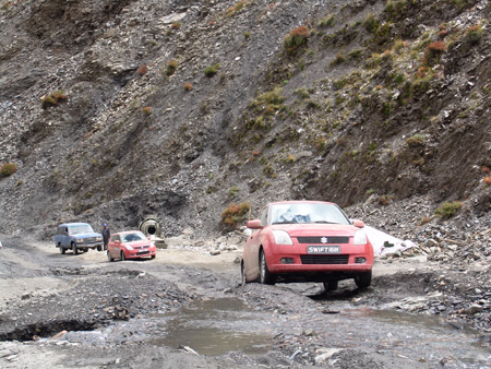 從日喀則經拉孜到定日,其中最難走的一段莫過于拉孜到定日的84公里,由于落差很大,道路只能由碩大的卵石路鋪成,有的地段坑洼不平、翻漿嚴重,有的地方灰塵滿天,有的地方被水沖斷,雨燕只能涉水而過,道路狀況非常糟糕,整段路程只看見四驅越野車和大卡車在路上艱難地爬行,SWIFT雨燕轎車是唯一例外。