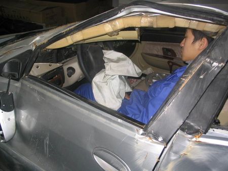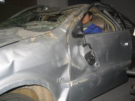 后經現場情況判斷,2#車駕駛員王波,經過一個多小時的高環試驗后,出現了疲勞反映,在環道出彎后,操縱動作過大,應急剎車后,因車速過快(近160公里),直接向左偏出路面,滑出5m左右寬的草坪后沖過40cm寬排水溝,撞向旁邊的灌木叢及土包并被彈起騰空2m以上翻滾后落在10m左右遠的草坪上,落下的狀態為車體底部朝上后部先著地。駕駛員王波因安全帶及氣囊的保護未受到嚴重傷害。