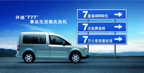 火熱的七月一汽-大眾更是將"激情"進行到底,現在購買開迪更是可以享受5座免費升7座、7次免費保養、動力總成7年或10萬公里的質量擔保(以先到達者為準)。開迪"777"優惠活動的價值總額超過1.8萬元,活動的舉辦將令更多用戶感受到開迪"您的專業伙伴"的質量保證和貼身服務。