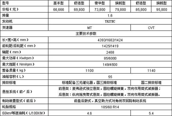 旗云之星裝備世界著名的1.6升TRITEC發(fā)動機,提供手動和CVT兩種驅(qū)動模式,共6種型號可供選擇,基本價格¥66,666;旗云則裝備奇瑞自主研發(fā)的CAC1.6升和1.3升發(fā)動機,1.3升型號最早9月上市,屆時旗云這個商品名下至少會有6種型號供消費者選擇,整個旗云品牌將會提供不少于12種型號。