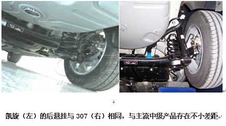 凱旋懸掛系統不具備雪鐵龍現有中級車的標準(與307相同),也難和其它中級車競爭 不論是廠家還是消費者對B級車(或者稱為中級車)的要求顯然要比A級車高出很多,而底盤是決定一臺車操控性、舒適性,以至車輛價值的重要因素。 標致--雪鐵龍集團的A級產品都使用了相同的底盤,具體表現就是C4與307具有相同的懸掛系統——前麥弗遜+后縱臂扭轉梁式,彈性原件均為螺旋彈簧。標致的B級車407使用了前雙叉臂+后多連桿式;雪鐵龍B級車C5則使用了主動液壓懸掛系統來改善車輛的舒適性并實現了底盤的隨時升降、大大增加了通過性。 而凱旋轎車的前后懸掛與標致307(以及C4)相同——凱旋的懸掛系統并不能代表雪鐵龍的B級車水準,在舒適性、通過性上都無法讓乘客享受到雪鐵龍B級車的水準。目前新一代的B級轎車大部分都采用了技術含量更高的多連桿后懸掛(君威、M6、蒙迪歐、銳志、帕薩特B6、雅閣),雪鐵龍的C5則裝備了主動液壓懸掛,凱旋的懸掛系統在形式、技術含量以及表現上恐怕都不足及和國內在售的B級轎車抗衡。