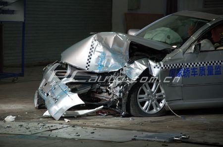 當(dāng)天下午,一輛裝有兩個(gè)碰撞假人和多種測試儀器的國產(chǎn)豐田銳志轎車,停放在牽引索道的盡頭。現(xiàn)場一切準(zhǔn)備就緒后,這輛銳志便以目前國內(nèi)公開測試中,車輛所達(dá)到的最快速度(64km/h),以正面偏置碰撞的方式撞向固定物體(車頭撞擊面約50%)。巨響之后,沖擊力使銳志退后數(shù)米,并向右后方轉(zhuǎn)動(dòng)了約45度。受到撞擊的銳志車頭左側(cè)嚴(yán)重變形,不過發(fā)動(dòng)機(jī)并未后移,而是下沉至發(fā)動(dòng)機(jī)艙的底部。在現(xiàn)場觀察中看到,這輛銳志的頂部(天窗后部位置)發(fā)生輕微折皺,且左側(cè)A柱出現(xiàn)凹陷,不過A柱本身沒有彎曲。車門在碰撞過程中始終處于關(guān)閉狀態(tài),撞擊后工作人員很容易將其打開。總的來說,在碰撞結(jié)束后,駕駛員一側(cè)的車頭內(nèi)移,但沒有對駕駛倉造成沖擊,車內(nèi)駕駛員的腳部地板也沒有發(fā)生內(nèi)凸現(xiàn)象,車身整體結(jié)構(gòu)形狀保持完整,駕駛員及副駕駛員均擁有足夠的逃生空間。從這輛銳志的這些撞擊后的特征看,這款銳志車達(dá)到了安全設(shè)計(jì)要求,能夠在被動(dòng)安全上對駕乘著提供的保護(hù)。至于假人的具體測定值是多少?沖擊力實(shí)際會(huì)假人造成多大傷害?還需要等待日后技術(shù)人員給出答案。