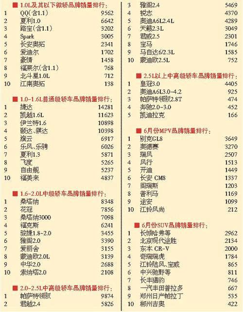 從總體上看,除了1.0L-1.6L排量區(qū)間的銷量總體有所收縮外,其它幾種車型銷量在總體上有所放大,銷量也比5月份有所回升。這與車市目前泛濫的“崩盤”傳言有所不符。