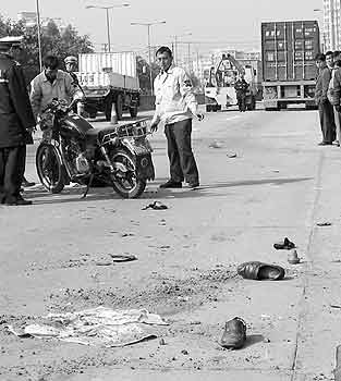 車禍發(fā)生在該路段自東向西一側(cè)車道上。路面上還留有大片的血跡,上面已經(jīng)鋪上了沙子。兩只男式皮鞋留在路面上。沿途還有一些摩托車部件的碎片。半個頭盔拋在幾米之外。在現(xiàn)場前面約20米處,有一輛大型貨柜車停在路邊。據(jù)了解,那就是肇事車。