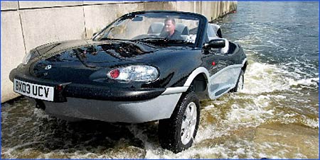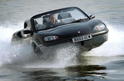 這就是英國最新推出的水陸兩用汽車。車底改裝為類似游艇的防水金屬底盤,從陸地到水里,只要一個按鍵,就可以將車輪收起來,車子立刻變成游艇。這款新車時速最高可達每小時近一百六十一公里,在水上,則可達每小時四十八點三公里。過去要開發這種商務水陸兩用汽車,都因為車體無法順利從游艇變回汽車而沒能成功,如今經過七年的研發,終于突破技術,推出這種過去只有在類似007 電影里才會有的高科技產物。不過,要想過過當超級情報員的癮,代價可不便宜,因為目前一輛要價是25萬5千美元。