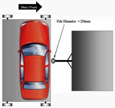 在NCAP的規則中,圓柱碰撞是這樣定義的:“為了鼓勵汽車生產商進一步保護乘員的頭部安全,歐洲NCAP特地引入了圓柱碰撞。側面安全氣囊有助于乘員在這種碰撞條件下的提高生存的可能。在最新的實驗里,被測車輛以29kmh(18mph)的時速沖向一直徑為254mm的剛性圓柱。因為圓柱相對車身十分狹窄,因此通常會從側面沖擊進車內!