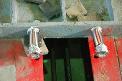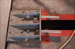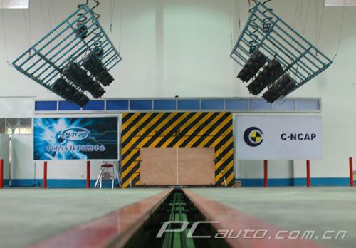 地面的索道用以牽引被測試車輛,這段直線加速路段全長120米,好似航空母艦上的蒸汽彈射裝置。車輛達到預定速度后,在距離碰撞壁7米的地方脫離牽引索道。在這里安裝有脫鉤機構,用以脫離牽引車子的繩索和套鉤。下圖為索軌停止的地方,兩根鋼管在為牽引裝置停止做出緩沖后發生褶皺變形。從圖中可以看出褶皺非常規則,最大限度的吸收撞擊時的能量。這與車頭的縱梁設計有異曲同工之妙。(未完待續)