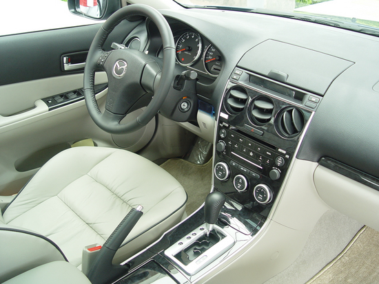 打開車門,記者發現內飾的變化要遠遠大于外觀。原有的金屬感極強的中控臺的形狀、材料和表面處理都有變化。表面處理上,新MAZDA6大量采用了高檔車上廣泛應用的水壓轉印技術處理內飾板的表面,中控臺、換擋桿底座以及儀表盤都采用了類金屬邊框裝飾。原有的鑰匙系統全面升級到豪華車水平。原先的亮銀色裝飾板換成了采用水壓轉印技術的黑色木紋飾板,深色的儀表臺與乳白色鑲黑邊的座椅形成鮮明的對比。雖然內飾的其他部位還在使用黑色的塑料,但做工的精細程度也有了提高,至少,塑料感不那樣重了。 此外,新MAZDA6的座椅采用了座椅面加長的桶狀座椅,并采用了更高質感的皺紋真皮包覆。除了駕駛席側車門,其他三個車門內飾板扶手上都增設了垂直門把手,并將水平扶手的表層包覆層改為軟化材料,這更符合人體工程學。在記者這個年齡(不足30歲)層消費者的角度來看,這些改變似乎削弱了MAZDA6的前衛感,垂直把手以及鋼琴鍵式控制按鈕等設計的美觀也值得商榷,但不可否認的是,更高年齡層的消費者可能會對這些情有獨鐘,而且這些改變對舒適性的增強也是不言而喻的。在2.3 L車型上,新MAZDA6還在內后視鏡上方的顯示屏上設置了后排座椅安全帶提示。全新裝備的雨滴感應式雨刮傳感器也被集成在這個底座內,這個傳感器還用來感知外界光線的強弱以啟動或者關閉照明系統。