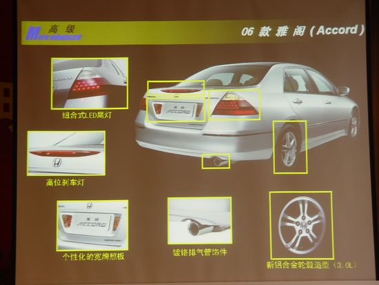 [前言]者今天參加了06款新雅閣的試車活動,當我在主會場旁邊停車處放車,在旁邊一排的好幾輛無牌(新款)車我都沒有留意,后來才發現全部是06款的……,走到主會場門口,我想這是新車了,但第一眼見到06款雅閣(正面),可以說是沒什么感覺,而當你走到后面卻發現了很大的不同,老實講這款車的最重要的幾個部分:底盤、發動機、傳動系統沒有任何變化,或者說沒有雅閣1998款轉至2003款那樣的“驚艷”,令人懷念。筆者在現場曾對著06款雅閣尾部和另一記者與某經銷商打趣道:這個尾巴把HONDA標識全部去掉,換上奔馳LOGO,還真是難辨真假啊……