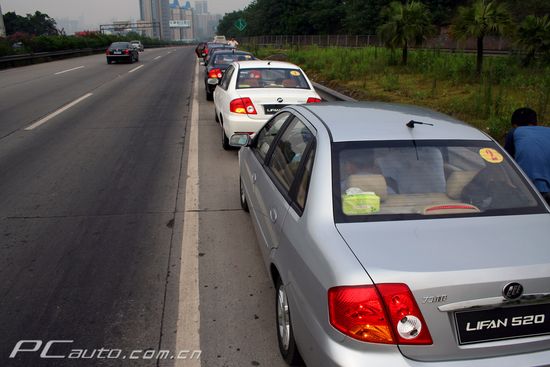 7臺力帆520新車在內(nèi)環(huán)高速公路邊整裝待發(fā)