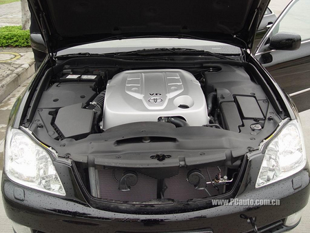 我們看到皇冠的發動機內部十分的整潔,由顯高檔的汽車的裝配。發動機采用V型6缸雙頂置凸輪軸24氣門,雙VVT-i。最高功率:170km/6200rpm。最大扭矩:300Nm/4400rpm。最高車速235公里/小時,手自動一體6檔變速器。