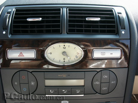 標準的功能配置,加上恰當好處的一小塊仿桃木片,與小鐘、印有彩色符號的控制鍵像配合,給人感覺要比君威2.0標準版高級不少,兩者可能成本相差不大,但顯然蒙迪歐的設計更為討巧。淺色座椅等則增加了溫馨感,使得蒙迪歐既具有公商務車的大氣又兼具私家車的人性化。從細微之處卻可以體現出一種古典風格,例如中控臺上的石英鐘,讓人感覺到些許古典浪漫的氣息。