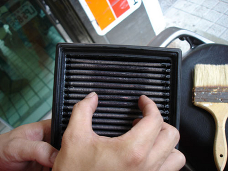 在確定濾芯確實風干之后,便使用專用的過濾油,均勻涂抹在每一條過濾棉上。注意油不用太多,也不用從頭涂到尾,只要上中間部分就可以了。