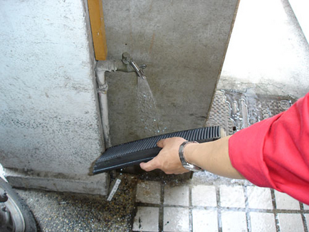 大約等個10到15分鐘,就用水將濾芯清洗乾凈,注意不要用高壓水槍,這樣會破壞濾棉的結構。