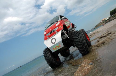 當我們還在為進入美國市場的Smart Fortwo以及巴黎車展上的迷你車而覺得這家伙小巧可愛時,看到了這個龐然大物,上車體就是我們那可愛的Smart,而下面的輪子你猜多少?直徑1米4,上車好困難哦!DaimlerChrysler打算通過這輛車向人們展示SMART品牌的魅力,和希臘長距離賽車手Stefan Attart合作,用其開發的底盤,造就了這輛奇車,取名Forfun2。