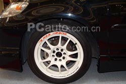 其實導致三廂飛度外觀不好看其中一個原因就是其原廠的175/65/R14的車輪讓人覺得有一種“車大輪細”的感覺,在這臺“City“上裝備的是195/60/15 Bridgestone Potenza SO-3s輪胎,型號為“無限MF-10L”的車輪,這里的后綴L代表“Lightened”——“超輕”,使用的材料是被認為最輕的合金鎂材,輕量化始終是“無限”追求的目標。