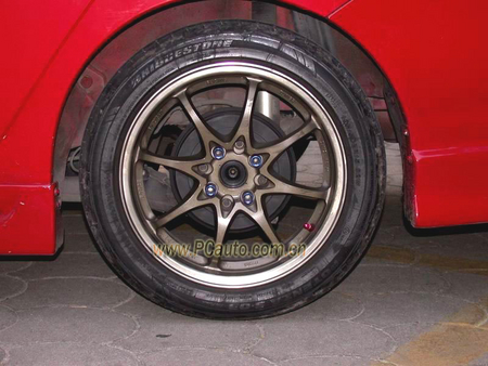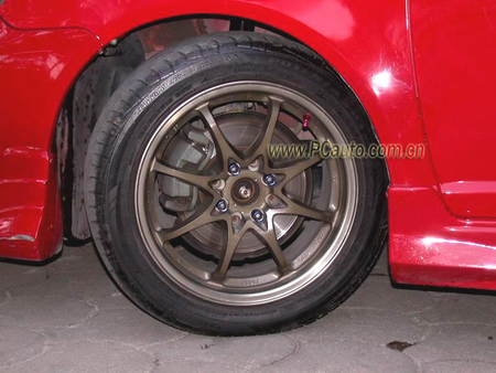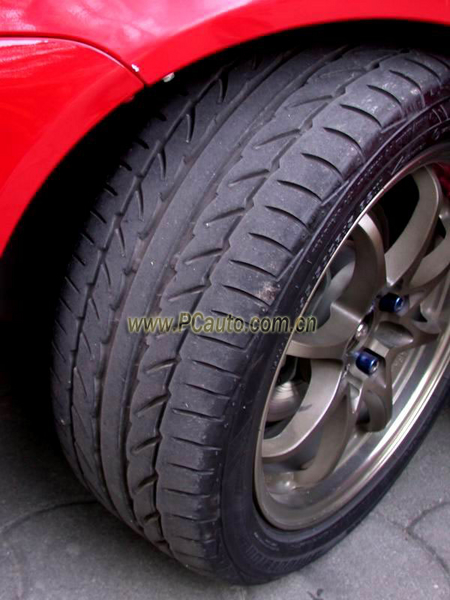 在車主激烈的駕馭下,這輛威樂在短短的4個月時間里已經換上了第二套輪胎,之前的一套輪胎是195/50R15的YOKOHAMA ES100,這套輪胎的設計較為舒適,所以抓地力平平,第二套輪胎換上了有街胎王之稱的石橋S03,抓地力隨即有了質的飛躍,同時更換上臺制超輕輪圈,令懸掛反應更敏捷。