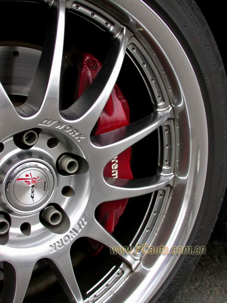 日本WORK18寸輪圈搭配SUMITOMO 225/40R18單向輪胎,和BREMBO雙活塞對向后剎車分泵