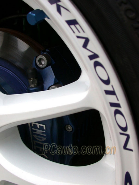 剎車是飛度的一大弱點,但正是這一弱點更堅定了車主更換高品質剎車系統的決心,PCauto介紹的這臺飛度安裝了日系頂級剎車品牌——ENDLESS的6活塞對向卡鉗,這款剎車除了剎車力道強勁外,最主要的特點是其舒適性;6個活塞中有2個是小型活塞,在制動的初期先由這兩個小型活塞運作,這樣便不會出現制動初期剎車力度過分強大的現象。更換了力道強大的前剎車系統后,原廠的后輪鼓剎自然不能滿足需要,更換上加大的制動后碟剎系統則能更好的保持前后輪的剎車平衡。