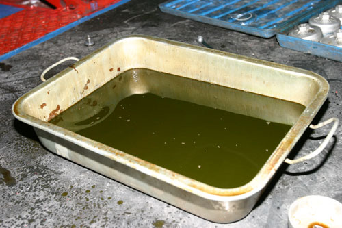 為了加快換油時間,避免引擎冷卻,連筆者都“下!迸c技師鎖機油濾芯,還要Focus的濾芯位置正好在引擎下方,因此操作起來還算順利,不過新車1000公里后換下來的機油很臟