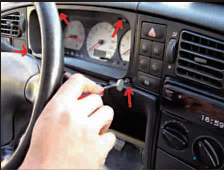 2.準(zhǔn)備工作好了,開(kāi)始拆卸儀表盤了,先把圖中儀表的四顆螺絲拆掉(圖中紅色箭頭指的四顆螺絲),把拆卸下來(lái)的螺絲都放到小盒中,防止丟失。
