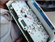 6.拆到這步的時(shí)候,可以不用向下再拆了,直接把表針擰下來(lái),把原來(lái)的鋁片表盤拿掉,直接裝冷光表盤就行,驅(qū)動(dòng)器接大燈開(kāi)關(guān)后面的引線。表針不是硬拔的,硬拔很容易斷。需要擰到卡住的時(shí)候接著擰,邊擰邊拔,要膽大心細(xì)。先擰中間的公里表和右邊的轉(zhuǎn)速表,練熟了再擰左邊的水溫和汽油表,因?yàn)樽筮叺膬蓚(gè)針緊挨著,可以擰的范圍更小,需要你剛才那兩根針練就的經(jīng)驗(yàn)。