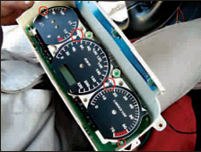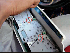 8.拆下老表盤后開始擰背光板的固定螺絲。剛才固定儀表鋁片六顆螺絲其實可以不用都上,3-4顆就夠了。因為這次的表盤由3個變成一個連體的了(如果您堅持要都上,也無所謂)。捷達(dá)的儀表有好幾批,螺絲的孔距略有些差別,在1毫米左右,如果背光板上的孔位置不合適,用鉆頭和小刀輕輕擴(kuò)個一兩毫米左右沒問題,不會傷到背光板電路的。注意螺絲別上緊,上到頭后需要回轉(zhuǎn)半圈到一圈。