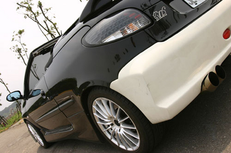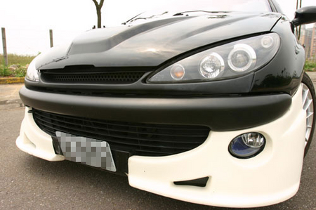 撇開沒烤漆不談,這組店家自行開發的大包其實相當好看,不但將原本206略嫌可愛的外表妝扮的霸氣許多,更突顯Peugeot家族的特色,將原本可愛溫馴的小貓,變成一頭準備撲殺獵物的大獅。而在材質的選用上,是使用玻璃纖維制成,有別于一般玻璃纖維的脆弱,不但使用純手工制作,在黏合膠質上更使用進口高密度膠,并增加整體厚度,不但沒有一般玻璃纖維易破易碎的缺點,更有著比擬PU質材的韌性,可說是相當具水準的國產套件。