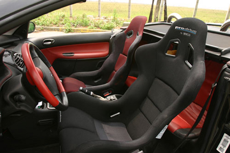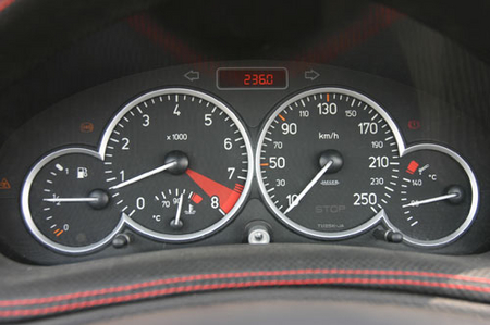 高檔的Spacro Prodrive搭配副駕的自有品牌碳纖維桶椅,提供了激烈駕駛時的良好保護 而在這臺車的內裝部分,RC原廠的紅線底8000rpm儀表板可說是所有206車主的夢想,而店家更巧手內藏了一顆超轉燈置于中央,辨識度相當好。店家自制的碳纖維飾板及特殊的類碳纖維真皮外加紅色縫線包覆原車內裝,出現在全車的各個角落,讓全車的質感向上提升許多。駕駛座上擺的是單張報價超過3萬,由Spacro代工的Prodrive賽車椅提供了車主激烈操駕時的良好包覆性。而副駕駛座上的碳纖維桶椅乃是店家自行設計后委外生產,其泡棉采用特殊記憶設計,對人體工學有很大的幫助。