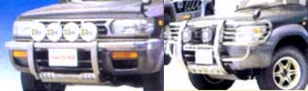 專門裝備越野車的保險杠(防撞杠)的種類很多,也可根據車型定做,簡單的只有一、兩根金屬杠構成,復雜的則有很多橫豎交錯的杠體和金屬隔柵或整形的殼體組成,有的還延伸到車頭的底部,形成防護拖板,可避免路面尖利的巖石損傷到前橋和底盤。