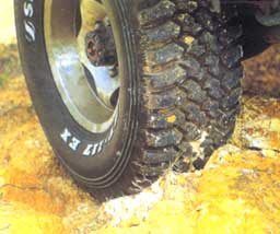 越野輪胎的斷面很寬,胎壁很厚,這主要出于增大接地面積,從而提高扒地性能和緩解來自地面的沖擊,減小震動的考慮;越野輪胎面上的凹槽很深,而且凸塊之間的間隙大,使車輪能夠有力地摳住地面,同時寬凹線還會形成較好的自清潔和導水能力:其中的泥土很容易被甩出,避免車輪空轉打滑,路面的積水也不會導致車輛發生滑水現象。