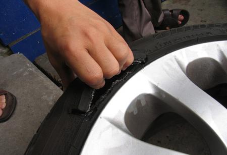 再靠邊停車仔細檢查,靠手模才發現輪胎和輪圈接觸部位有一突起,竟然是長達15厘米的大口子,胎壁很厚,但使勁扳開竟然可以將手指全部伸進去!此時離深圳還有190公里路程,又是夜晚,如此大的裂口,就近補胎是不可能的了,等待4S救援費用巨大不說(估計至少得2000以上),時間上也起碼要好幾個小時。心想反正輪胎是報廢了,不是說能續行250公里嗎,干脆試試把它開回去,于是一路就以70左右的速度巡航,差不多3個小時,開了200余公里終于回了家。路上除了有輕微震動外,轉向方面并無太多異常,只是快到家的時候感覺震動加大了些,估計損壞情況加大了。