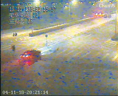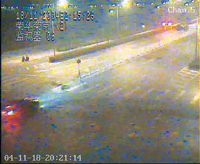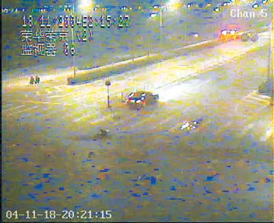 11月18日20時21分,在北京經濟技術開發區榮華路與榮京街交叉的十字路口中間,一輛疾速行駛的黑色小客車將一名橫過路口的騎車男子撞飛并拖帶出20多米遠,造成騎車男子當場死亡。事故發生后,小客車司機不但沒有停車救人報警,反而加速逃離現場。 昨天,記者通過路口電視監控系統拍攝到的錄像畫面看到,慘劇發生的時間是20時21分14秒。那輛肇事的黑色小客車直接從路口的東面沖過來,由于車速極快,司機發現從南面騎車過來的人后,還沒來得及采取任何制動措施就撞了過去(圖1)。