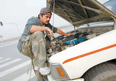 記者日前在該劇組探班,正趕上吳大維手持大扳手,一身臟兮兮,在拋錨的汽車前拍攝修車的戲。