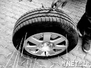 昨天,家住天通苑西二區(qū)的岳先生遇見了這樣一件讓人氣憤的事兒,自己4個(gè)月前剛買了一輛帕薩特轎車,前天一夜之間兩個(gè)輪胎就被人扎進(jìn)了18根烤肉串用的竹簽子,輪胎差點(diǎn)兒成了烤肉串。