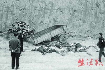在此次事故中,當場死亡的10名村民并排躺在農用車的旁邊,死者身邊到處都是灘灘尚未凝固的血跡,附近凌亂地丟棄著死者的鞋子和車上的食物等物品。一名死者的頭部摔出一個大洞,多數人面目全非,現場慘不忍睹。