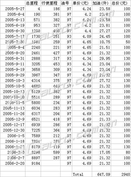 二、加油費:約4500元/年。在這八個月里,我經歷了廣州兩次油價的上升和一次油荒,97號油從剛買車的時候的4.24元/升變到現在的4.69元,升幅超過了10%,鬧油荒其間更是有錢也沒油加,要往市郊油站跑再排隊半小時才勉強地給加了,實在是難忘。在我的朋友之中我用車算是比較少的了,八個月中一共走了九千多公里,加油2940元,如果按這樣的頻率用車的話算一算一年約4500元左右吧。下面是我八個月中的費用列表。