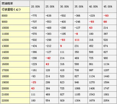 為了方便大家,這里用表格來處理,下面是不同里程數字下面不同油耗的車輛每年燃油稅比養路費模式都花的錢的計算結果。左側一列是公里數,最上面一行是不同車輛的油耗。計算公式:征收燃油稅后養車支出增加額 =A2(年行駛里程)×A1(年平均油耗)×30%(估算的燃油稅稅率)×4.65(北京當前93#汽油的油價,可隨時替換)÷100-1320(北京地區的一年養路費,可替換),有興趣的車友可以根據自己的實際情況用同樣的表格來比對進行計算。