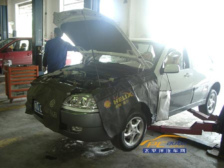 工作人員為車輛鋪上防護墊,以防車輛在檢測的過程中被弄臟或刮花。
