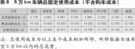 8款車的購買成本、正常保養成本、燃油消耗成本等固定開支都得出后,我們把這些數據全部列入表7,進行各項使用成本的對比,并且最后計算出車輛的總固定使用成本以及總節約成本。然后,除去購車成本的開支,計算出8款車純使用成本總費用,列入表8。從中,讀者可以清晰地比較出哪款車的使用成本最低,哪款車的使用成本最高。圖4為相應的柱狀圖。