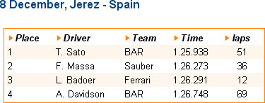 12月8日西班牙的杰雷茲賽道依舊下起了大雨,英美車隊的佐藤(Takuma Sato)在雨中做出最快的時間。佐藤今天是測試04年概念車,而另一位測試車手Anthony Davidson則駕駛著今年的賽車測試輪胎。他們總共做了120圈的測試,也是唯一有進行任何實際測試內容的車隊,他們今天主要是在進行半雨胎及雨胎的測試。