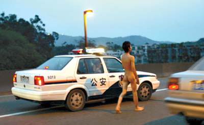 眼看前面就是恒福路出口,警車抓住機(jī)會(huì),車前右側(cè)緊挨裸男,逐步將其逼至倒“人”字形的出口處,但是裸男突然縱身一跳,跳到內(nèi)環(huán)路護(hù)欄處,十分危險(xiǎn)地走出幾步后,再跳到路面,繼續(xù)高歌前進(jìn),警車無(wú)可奈何,只好又跟在他后面尋找機(jī)會(huì)。由于怕阻塞內(nèi)環(huán)路交通,而且還有其他采訪任務(wù),記者一行目睹這一幕后離開(kāi)。