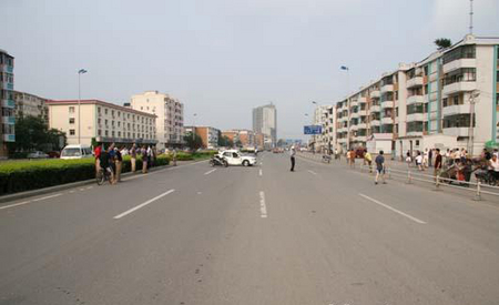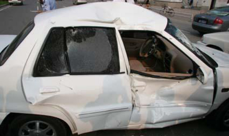 當時以為完了,送醫院,右大腿骨折,沒別的事,萬幸,夏利右側全扁了,A柱B柱C柱全完了,三面玻璃全碎,被拖車拖走的,BUELL表面鏡子破碎,轉向燈壞了,把有點歪,其它沒事,騎走的,老美的車就是結實。