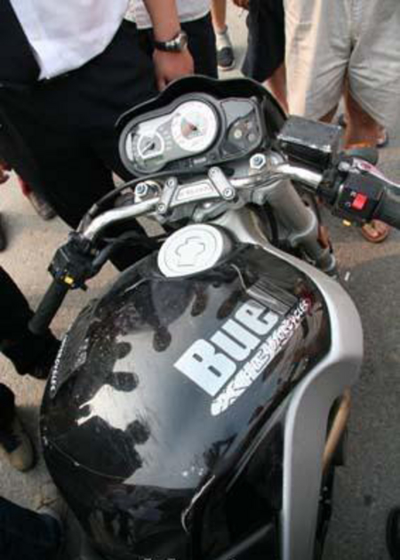一人騎的是BUELL XB9S,在黑牛城到世紀城門口撞了一輛對向掉頭去世紀城的夏利,當時時速一百二三。